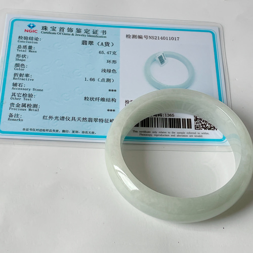 | メーカー | 【新入荷】本翡翠保証‼️天然翡翠氷糯種薄緑色バングル 内径約56.2mm 鑑定書付 |