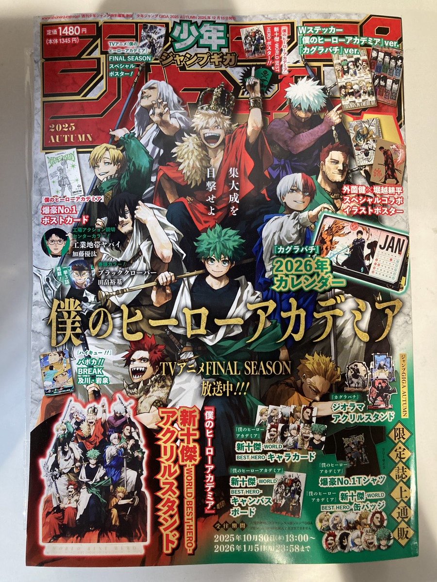 | 商品の特徴 | 入荷情報】 ジャンプGIGA 2025AUTUMN 入荷してます📘 ジャンプGIGA。ジャンプGIGA 2025AUTUMN 2025年10月30日(木)発売予定 詳細が本日公開。ヒロアカ大特集「ジャンプGIGA」2025秋号 10月30日発売! 豪華付録も!。。ジャンプGIGA 2025 AUTUMN | 週刊少年ジャンプ編集部 |本 | 通販 | Amazon。ジャンプGIGA 2025 AUTUMN 僕のヒーローアカデミア カグラバチ 【新品未開封 】※10冊セット※付録品完備⭐︎新品未使用⭐︎匿名配送⭐︎即購入可!初期傷がある場合がございますので、ご了承の上ご購入ください。「We offer immediate purchase approval. Our store deals exclusively in authentic products, so please feel confident in making your purchase.」ヒロアカ ジャンプ ギガ2025オータムカグラバチ僕のヒーローアカデミア・新十傑-WORLD BEST HERO-アクリルスタンド・爆豪No.1 ポストカード・Wステッカー「僕のヒーローアカデミア」「カグラバチ」・外薗健×堀越耕平 スペシャルコラボイラストポスター・新十傑-WORLD BEST HERO-ポスター!!FINAL SEASONスペシャルポスター!・カグラバチ 2026年カレンダー・ハイキュー!! バボカBREAK 及川・岩泉 | ||