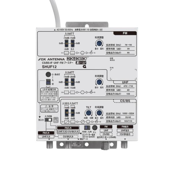 | 商品の特徴 | mmq_shuf12。新品】DXアンテナ CS/BS-IF・UHF・FMブースター SHUF12 CS/BS-IF・UHF。楽天市場】DXアンテナ 2K・4K・8K対応 BL認定品 共同受信用CS/BS-IF。4K8K衛星放送(3224MHz)対応CS/BS-IF、UHF、FM/V-Lowを増幅するブースターです。テレビ信号が弱い場合や、複数のテレビにテレビ信号を送る必要がある場合に電波を強くするために使用します。FM拡張帯域にも対応。Wi-Fiや携帯電話など電波の影響を受けにくく与えにくい、高シールド構造の製品です。耐雷性能をアップしています。入出力端子・電源端子JEC:±25KV(1.2/50μs)。増幅帯域:FM/V-Low 30dB、UHF 40dB、BS/CS 35/45dB。BL優良住宅部品認定品。[SH・UF-1]。屋内用。利得安定性を向上!夏季・冬季の寒暖差による利得ブレを防止。CS/BS-IF・UHFブースター | 製品情報 | DXアンテナ。。【新品・未開封】ATOMOS アトモス NINJA V ニンジャ5 ※送料無料。その他 Philips Hue Sync box 4K。【新品未開封】Xiaomi TV A Pro 43インチ 4K。【美品】Blackmagic ATEM Mini。Accsoon SeeMo バッテリー充電器セット。日本エイサー Acer Nitro ゲーミング モニター。新品未使用 スカパー HD対応チューナー TZ―HR400P。小型壁面端子 スイッチ切換式・テレビ端子台色交換タイプ WSKE7 ×4 | ||