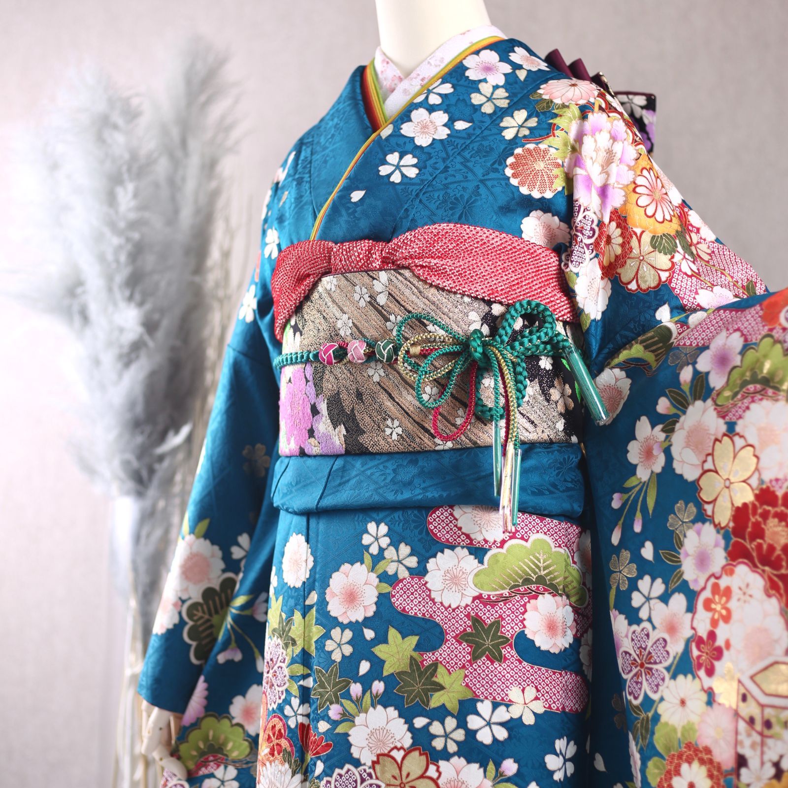 | メーカー | 振袖 フルセット 青緑 ブルーグリーン 青 緑 鞄 ピンク 草履 髪飾り 成人式 振袖 |
