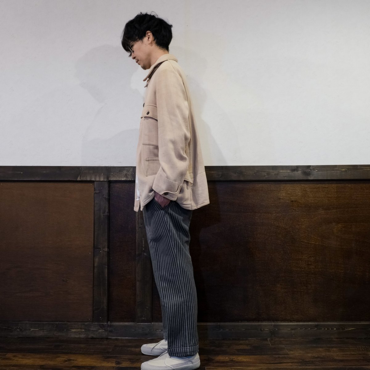| 商品の特徴 | 30-40s French Vintage Stripe Wool Trousers | U フランス。il_1080xN.6055685687_30tu.jpg。Sullivan Striped Trousers - Brown/White。50sのフランスのストライプ柄ウールスラックスになります。boutのオンラインで購入いたしました。落ち着いたブラウンの色味に細めのストライプでとても上品な1着です。フロントのボタンも特徴的で一癖ありながら、シンプルなデザインかつテーラードシルエットと何にでも合わせやすいです。古いパンツながらのサスペンダーボタン付きでベルトループはございませんが、サイドアジャスターがついておりますので調節しやすくなっております。少しサイズが大きめですので様々な方に着ていただけると思います。フランスの良さが詰まった一本、ぜひこの機会にいかがでしょうか。参考として購入したページに載っていた着画も載せています。サイズ(平置き)ウエスト:76cmワタリ:31cm股下:29cm股上:75cm裾幅:22cm素人採寸ですので、多少の誤差はご了承ください。。Cortana - Marcel, brown striped pants in linen and wool。。NOREMID RIGIT SUPER BAGGY DENIM 専用ページ。60s levi's 501 big-E Sタイプ W33 L30。schott ヒッコリーデニム 黒 34インチ。60s Lee WESTERNER 片耳 初期モデル インチ表記無 USA。EVISU エヴィス 大黒 赤耳 ホワイト No3 lot2001 34×35。SAMURAI デニム 22-020 33x36 S100XJ 刀十兵衛。levi's 501xx W46 アメリカ製 バレンシア 00s | ||