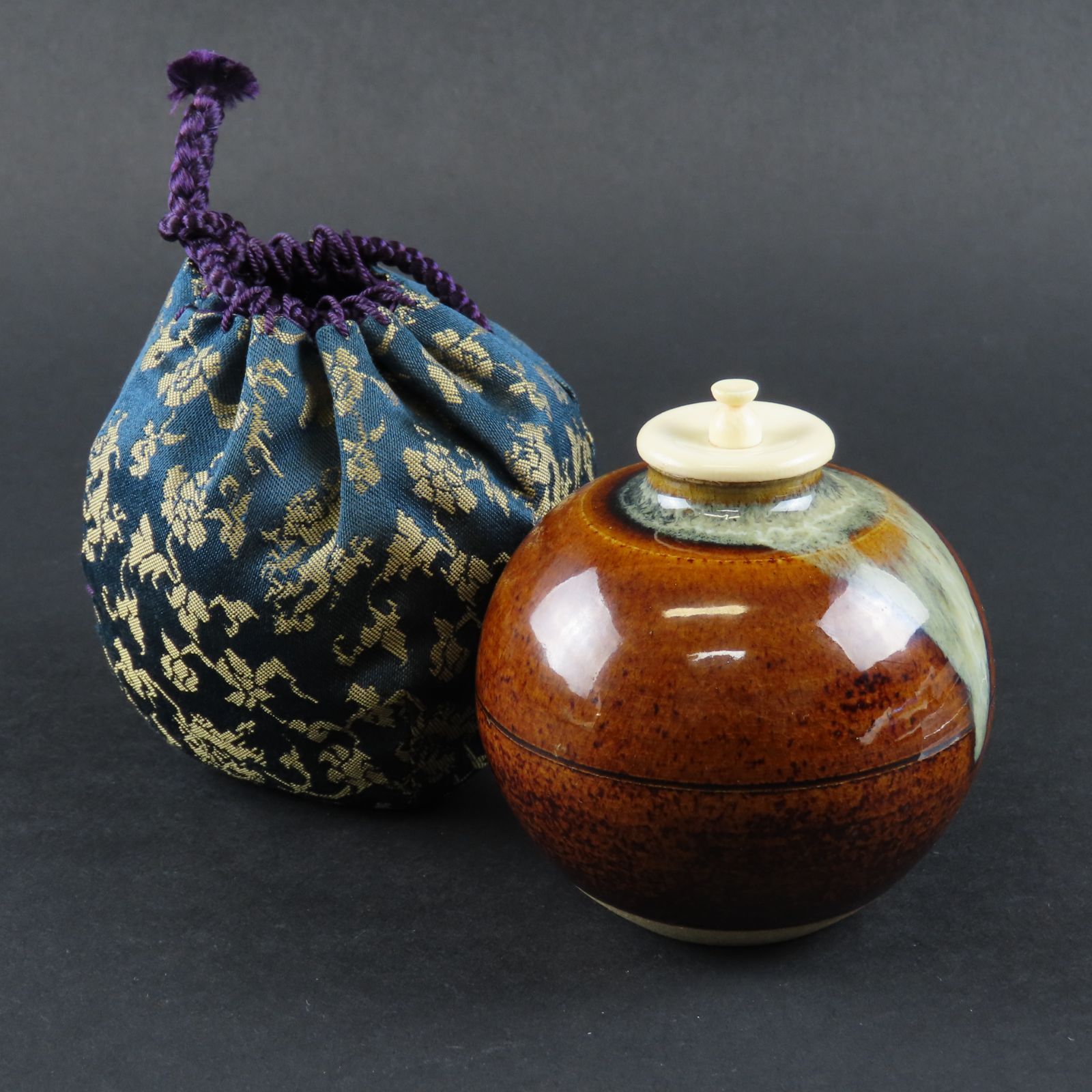 - 美術品・アンティーク・コレクション > 工芸品 > shunteian 高取焼十一代高取静山作瓢形茶入仕覆付共箱 V 7844 shunteian 高取焼十一代高取静山作瓢形茶入仕覆付